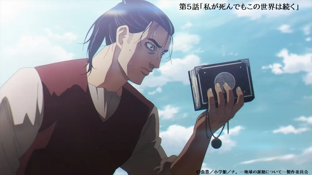 從拉斐爾發現石箱中滿載的地動說資料,到資料被焚毀,只剩奧克茲書中的感動,再到這些文字也化為灰燼,最後僅存杜拉卡臨終時寄出的信。主角們為真理付出一切,最終只留下了一個簡短的標題——《關於地球的運動》。某個偶然經過的男子聽見了討論,雖只是片語隻字,卻仿若凝聚了過往所有人的追尋,化作一個通往未來的「?」。